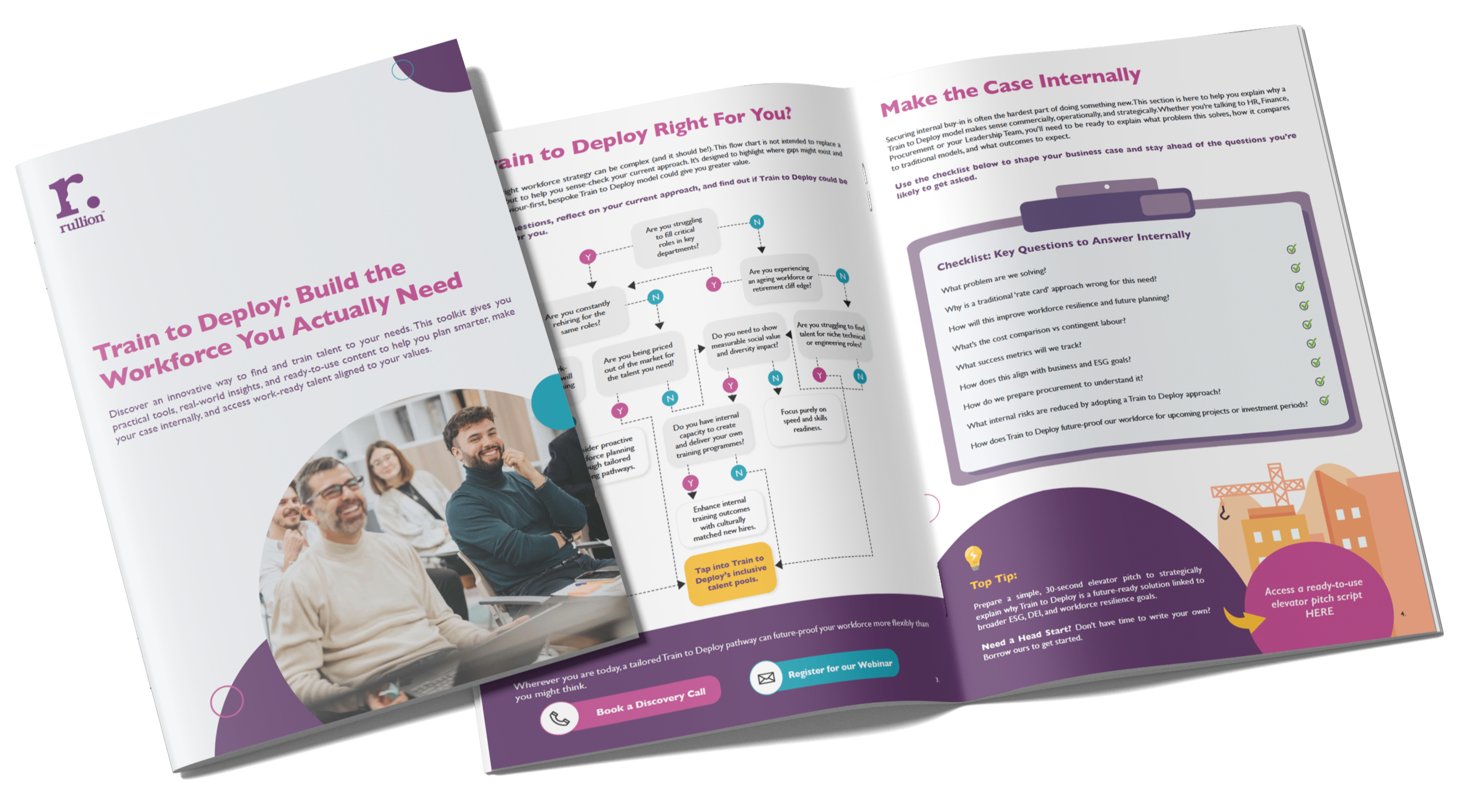 TTD flips the traditional model on its head. Instead of waiting for the “right” person to appear, you develop the capabilities you need within the people you hire or redeploy from day one. Rullion’s match-to-train approach directly addresses the root cause by designing role-specific training and onboarding ahead of deployment, ensuring the people coming into your organisation are better equipped, aligned, and more likely to stay. You’re building the talent you need, sustainably.